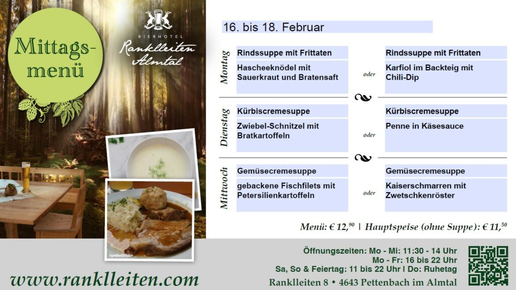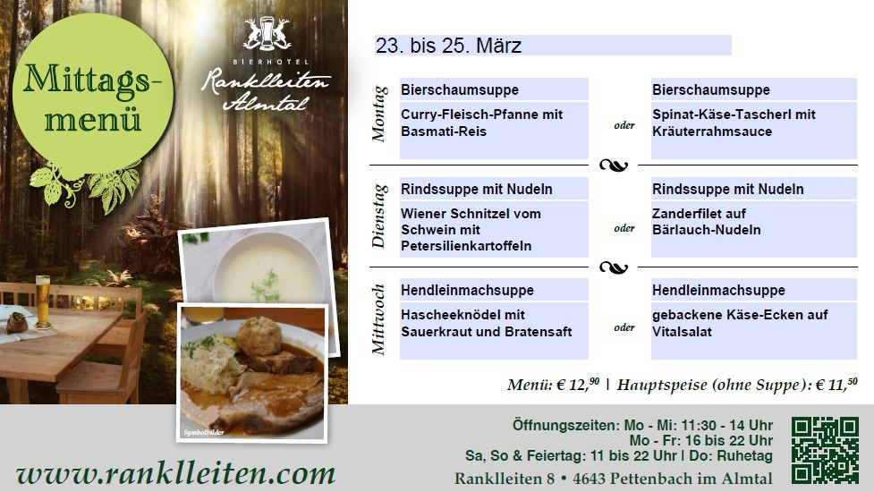 Montag bis Mittwoch 11.30 bis 14.00 Uhr (Mittagsmenü & kleine Speisekarte)